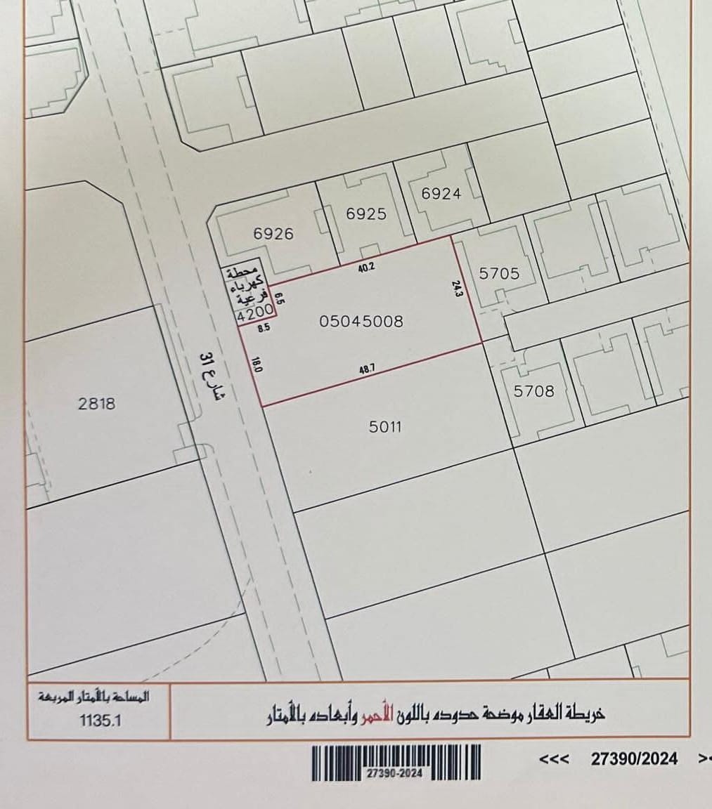 Residential Land for Sale in ِAl Markh with a classification of RA (Private Residential Area -A). The Land size is 1135.1 SQM, priced at 24.00BHD per SQFT , with a total price of 293,237.280BHD