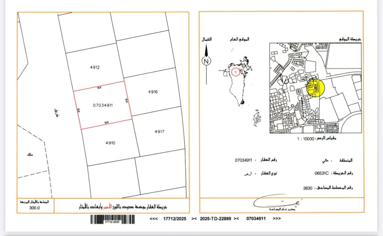 Residential Land for Sale in A'ali with a classification of RA (Private Residential Area -A). The Land size is 300 SQM, priced at 31.00BHD per SQFT , with a total price of 100,105.200BHD
