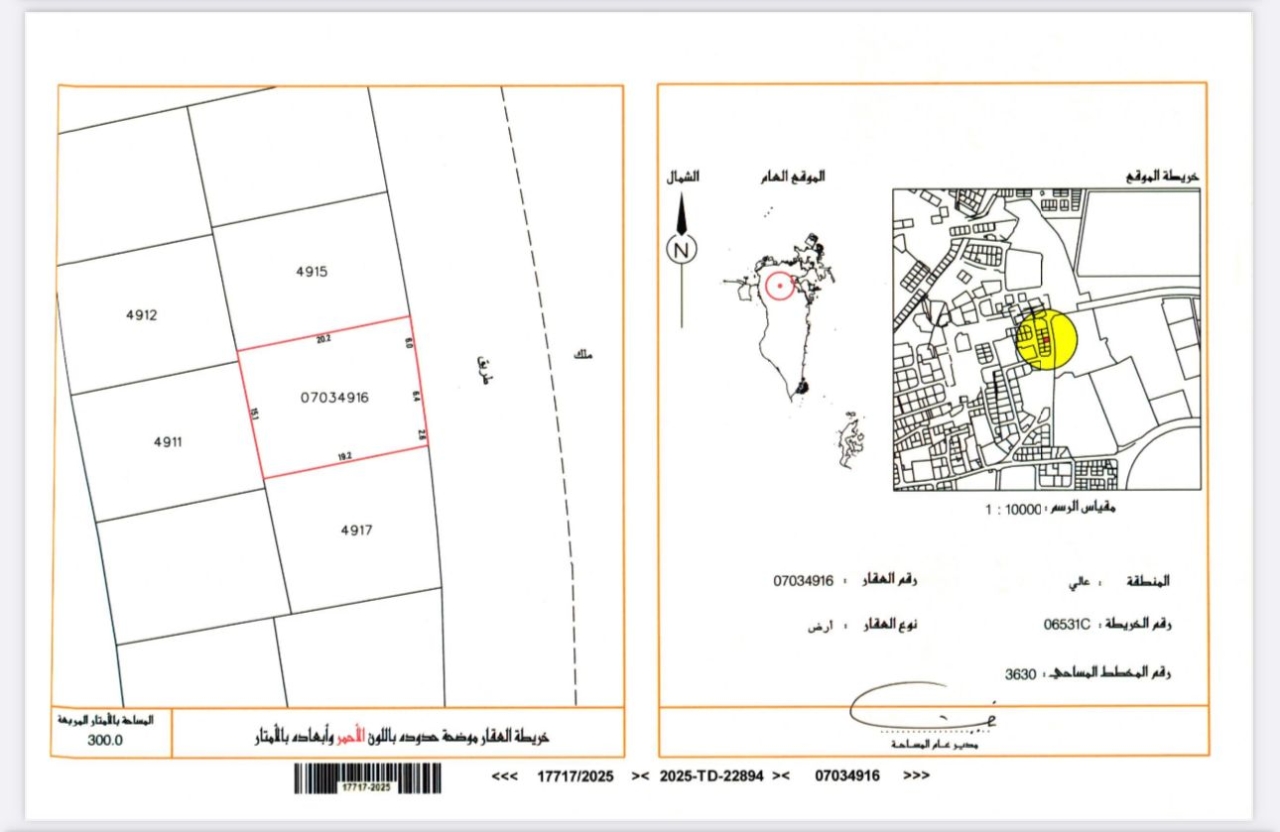 Residential Land for Sale in A'ali with a classification of RA (Private Residential Area -A). The Land size is 300 SQM, priced at 31.00BHD per SQFT , with a total price of 100,105.200BHD