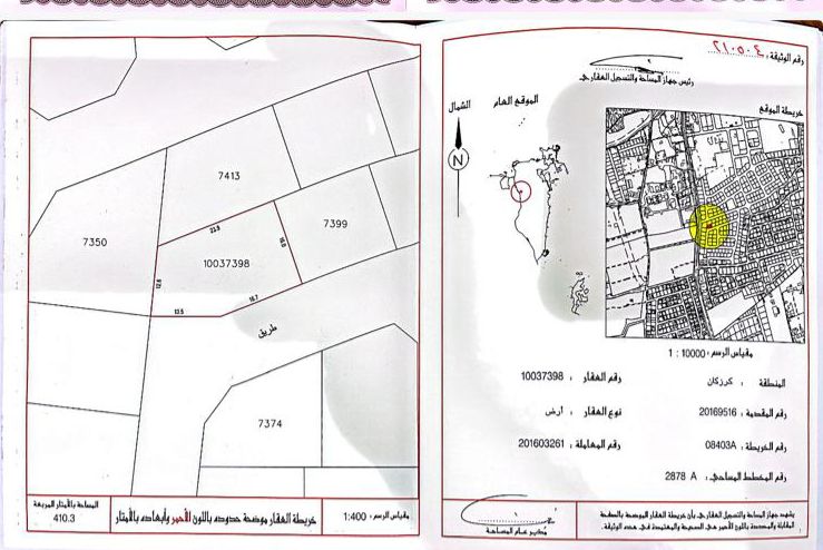 Residential Land for Sale in Karzakan with a classification of RA (Private Residential Area -A). The Land size is 410.3 SQM, priced at 37.50BHD per SQFT , with a total price of 165,617.625BHD