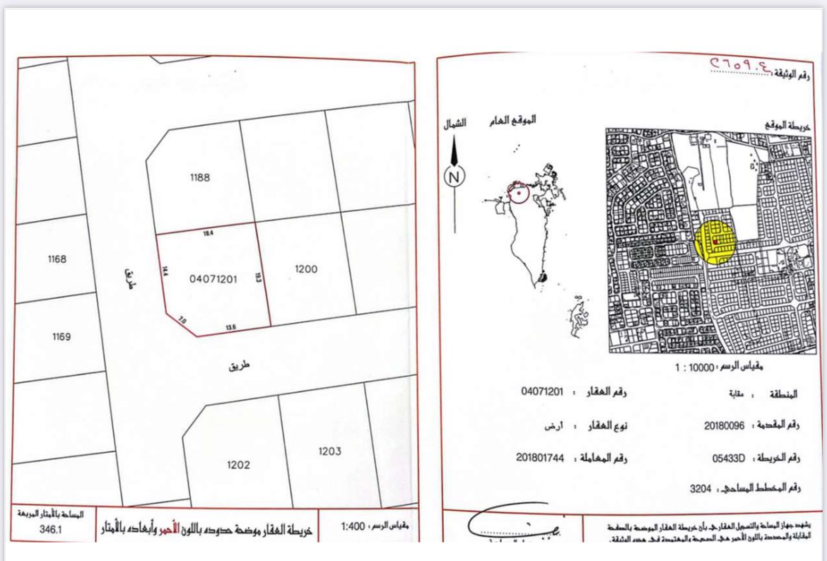 Residential Land for Sale in Maqaba with a classification of RA (Private Residential Area -A). The Land size is 346.1 SQM, priced at 28.50BHD per SQFT , with a total price of 106,174.470BHD