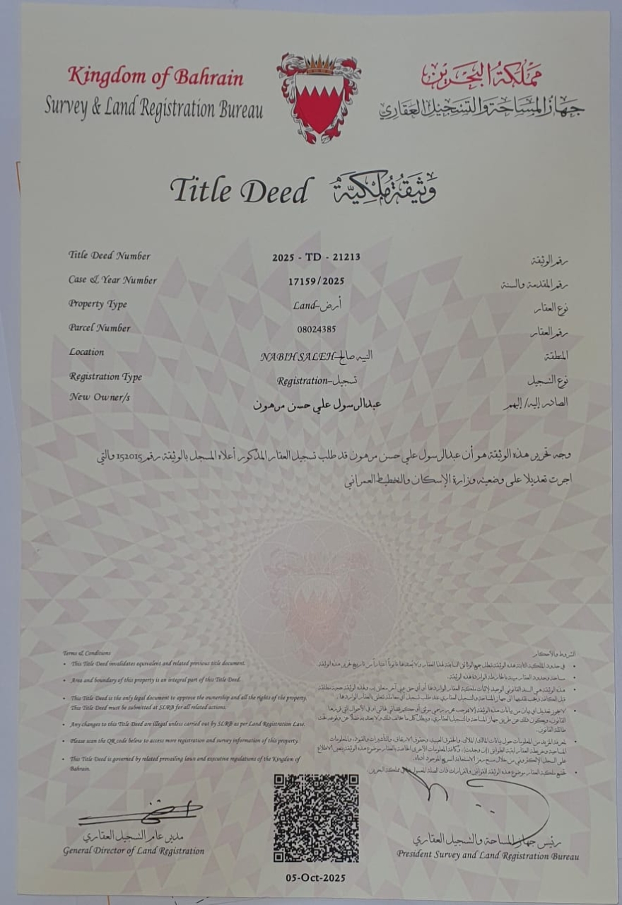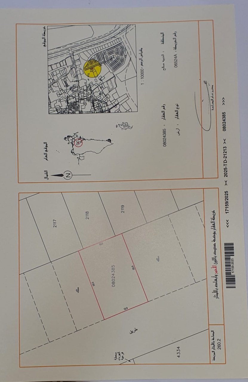 Residential Land for Sale in nadih saleh with a classification of RHA (Connected Residential Area – A). The Land size is 260.2 SQM, priced at 32.13BHD per SQFT , with a total price of 90,000.586BHD