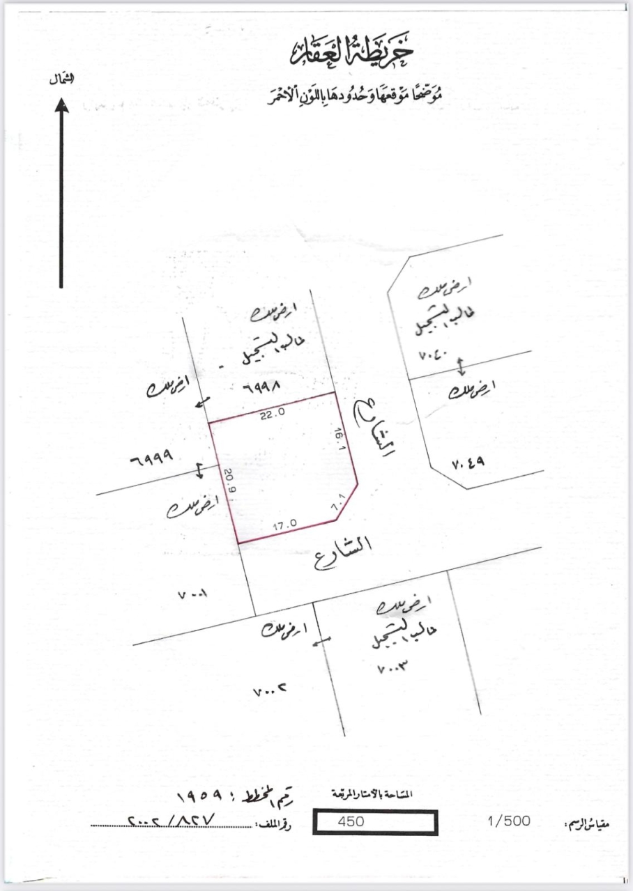 Residential Land for Sale in Shakhoora with a classification of RB (Private Residential Area - B). The Land size is 450 SQM, priced at 27.00BHD per SQFT , with a total price of 130,782.600BHD