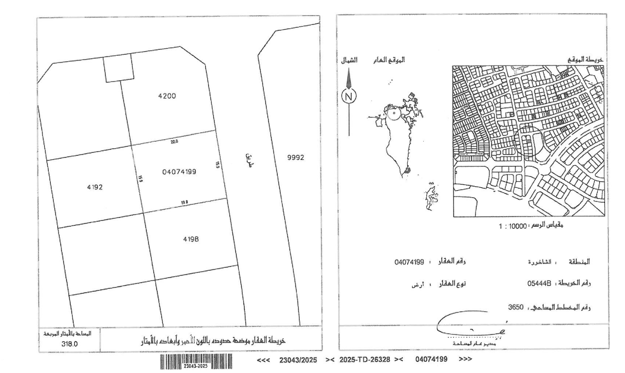Residential Land for Sale in Shakhoora with a classification of RB (Private Residential Area - B) located on One Road. The Land size is 318 SQM, priced at 30.00BHD per SQFT , with a total price of 102,688.500BHD