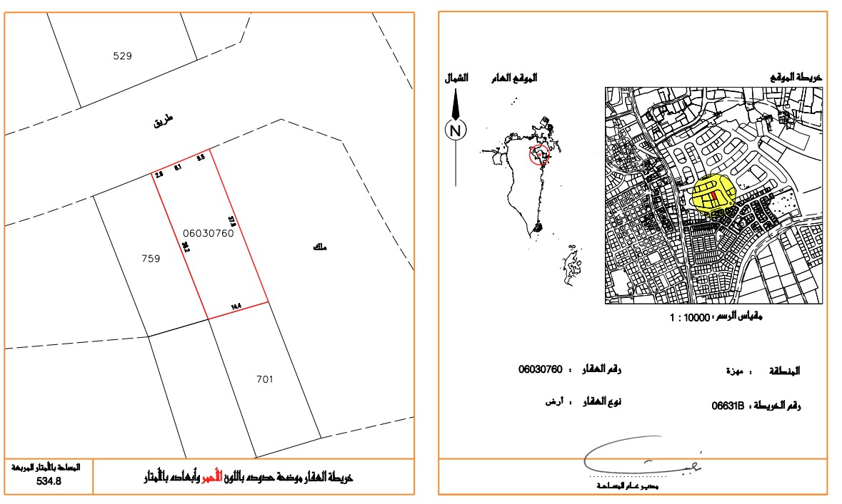 Residential Land for Sale in Sitra with a classification of RA (Private Residential Area -A) located on One Road. The Land size is 534.8 SQM, priced at 23.00BHD per SQFT , with a total price of 132,401.570BHD