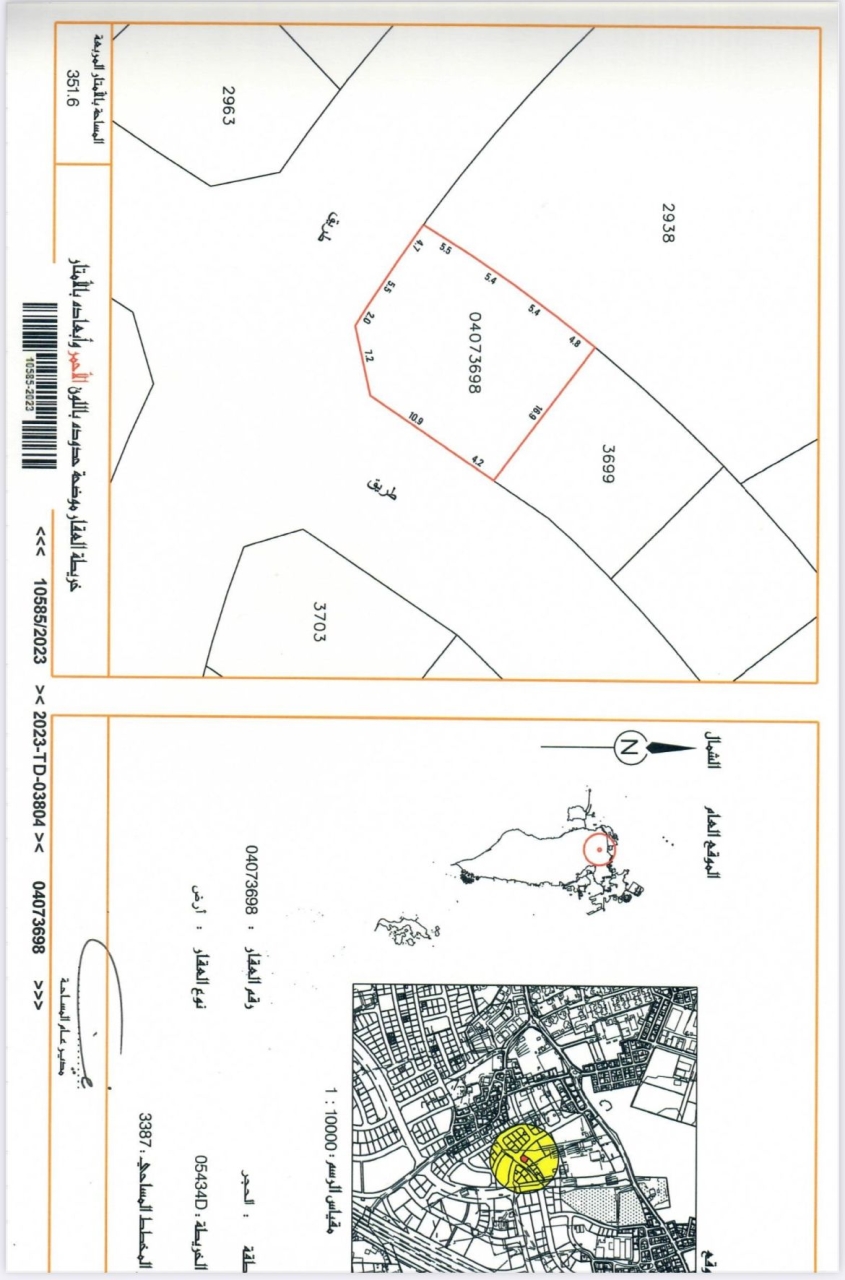أرض سكنية للبيع في الحجر بتصنيف RA (سكن خاص - أ) تقع على شارعين (زاوية). مساحة أرض 351.8 متر مربع, بسعر 26.00د.ب لكل قدم مربع , السعر الإجمالي 98,456.280د.ب