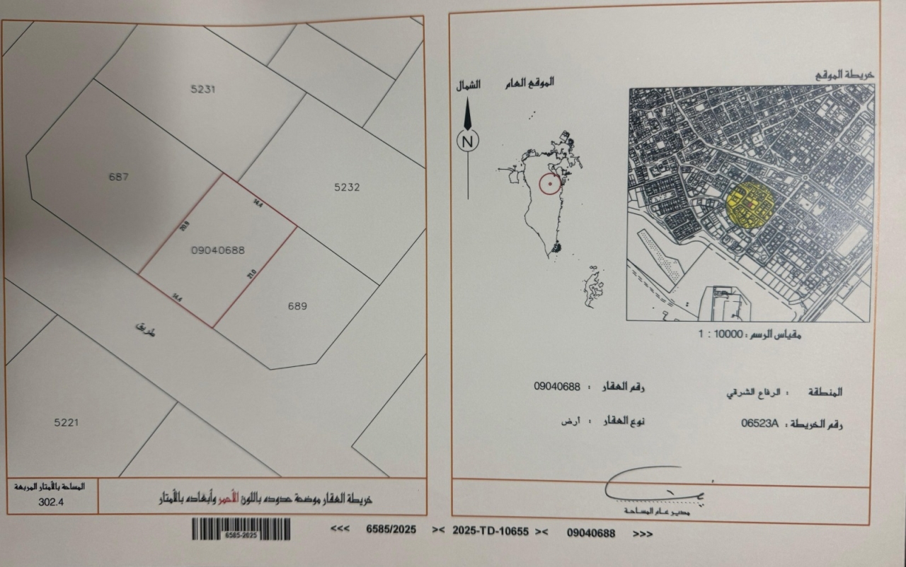 أرض سكنية للبيع في الرفاع الشرقي بتصنيف RB (سكن خاص - ب) تقع على شارع واحد. مساحة أرض 302.4 متر مربع, بسعر 28.00د.ب لكل قدم مربع , السعر الإجمالي 91,140.840د.ب