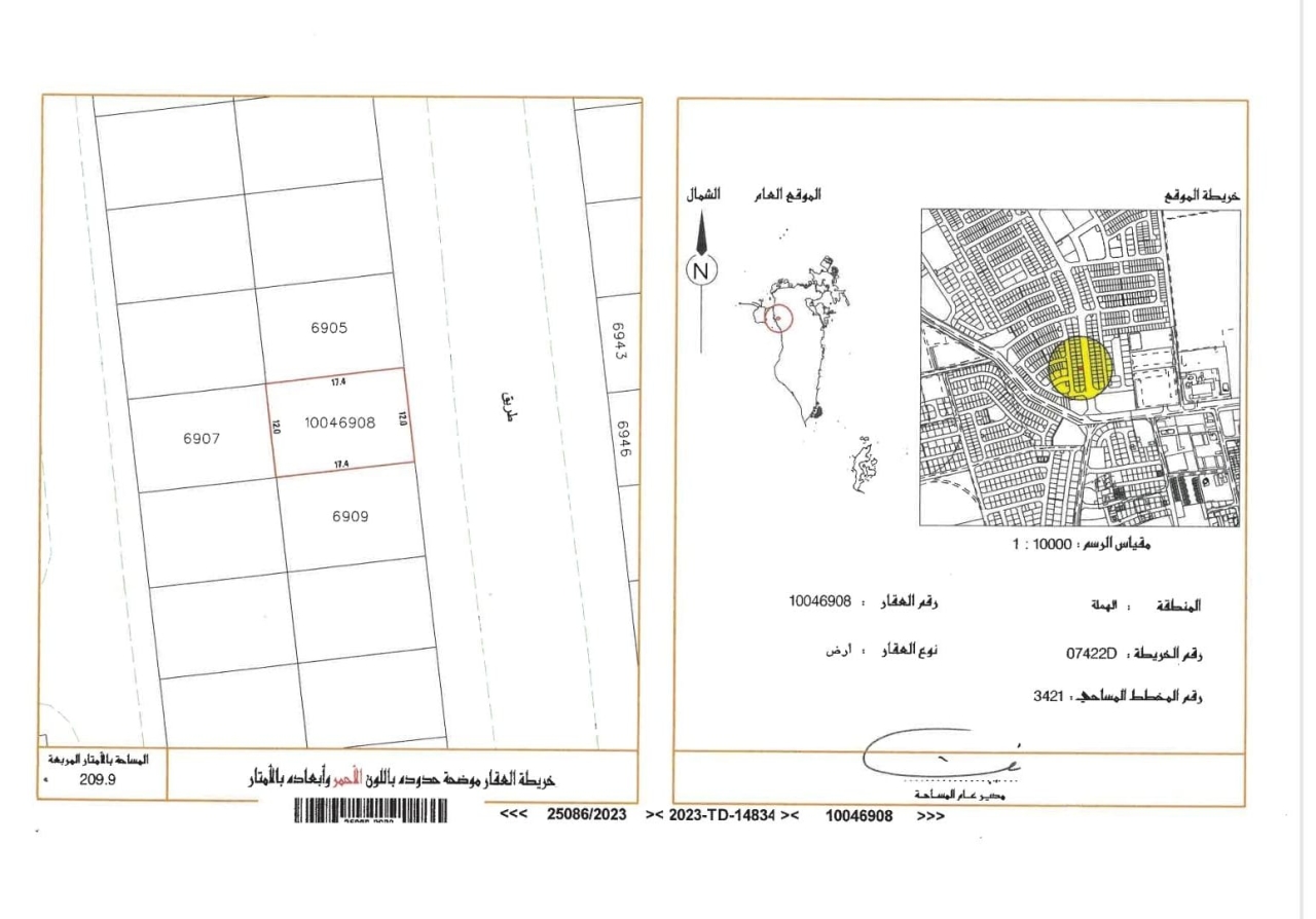 أرض سكنية للبيع في الهملة بتصنيف RHA (سكن متصل - أ) تقع على شارع واحد. مساحة أرض 209.9 متر مربع, بسعر 29.168د.ب لكل قدم مربع , السعر الإجمالي 65,900.000د.ب